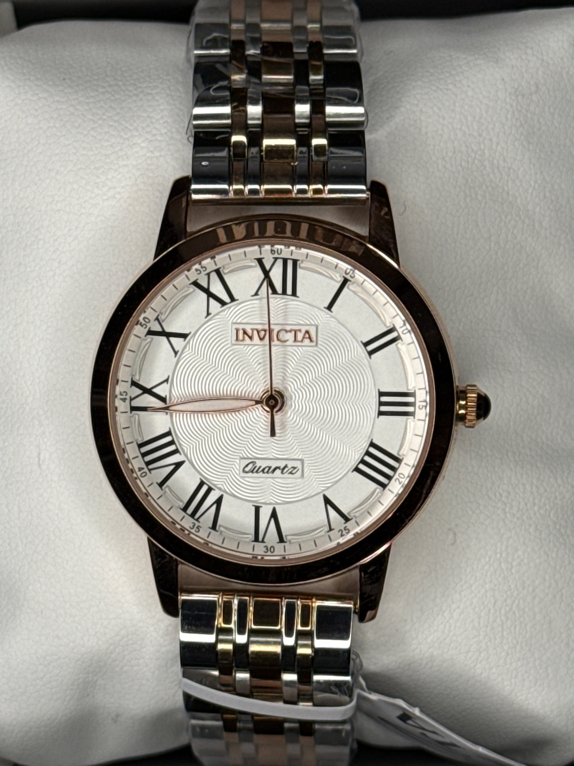 This impressive Invicta Wildflower watch features a precise Quartz movement as well as a rose case. Its silver, copper dial is enclosed by a highly protective Flame Fusion Crystal. This watch is finished by a strong gold, steel, band, and it offers 30 m water resistance.